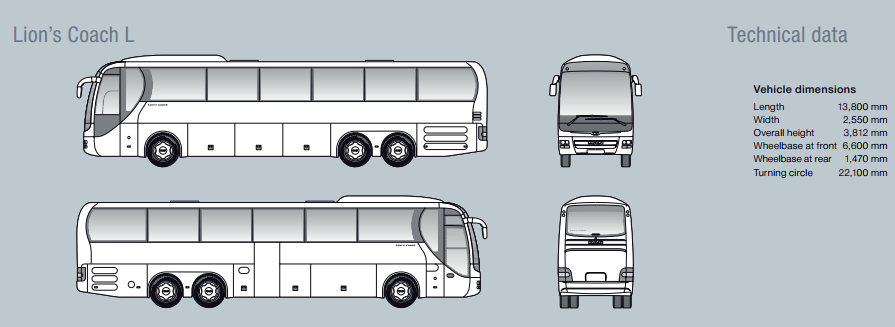 Az MAN által, kifejezetten hosszabb távú, turista jellegű utazásokra kifejlesztett Lion's Coach R09-es típusa kényelmes, komfortos utazást biztosít 55 utas számára. A hőszigetelt panoráma ablakokon keresztül az utazás során megfelelő kilátás nyílik a látnivalókra. Legyen szó reptéri transzferről, városnéző programról, vagy országokon keresztül vezető távolsági utazásról, ez az autóbusz biztosan minden igényt kielégít!